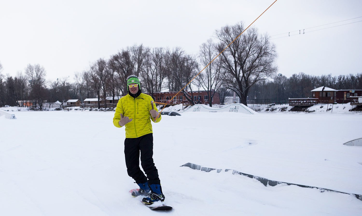 Креативне застосування звичних гірських лиж та сноуборду. Тільки кататися на них потрібно не по засніжених схилах, а на канатній дорозі за озером.