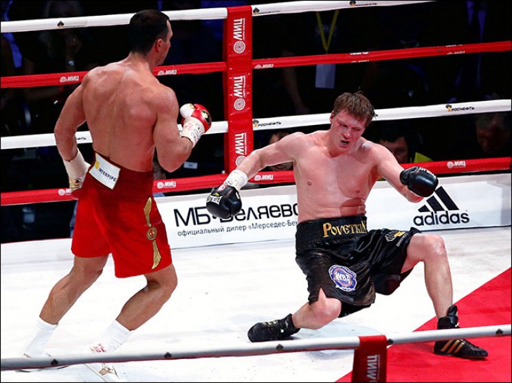 Другий бій запам'ятався більше через своє політичного забарвлення. 5 жовтня 2013 року в Москві в спорткомплексі «Олімпійський» Володимир влаштовує показову громадську прочуханку Олександру Повєткіну. Росіянин чотири рази опиняється на канвасі рингу. Українець його просто декласує - виграє бій з рекордним для чемпіонських поєдинків в суперважкій вазі рахунком. Всі троє суддів поставили 119: 104 (за правилами професійного боксу, виграний раунд оцінюється в 10:9, якщо при цьому він відправляє опонента в нокдаун - рахунок 10:8). Російська сторона тоді викупили права на бій на торгах за 23 мільйони доларів, що викликало здивування всього боксерського світу , адже вони запропонували ціну значно вищу за ринкову. В підсумку збитки від проведення бою московської сторони склали більше 10 мільйонів доларів.