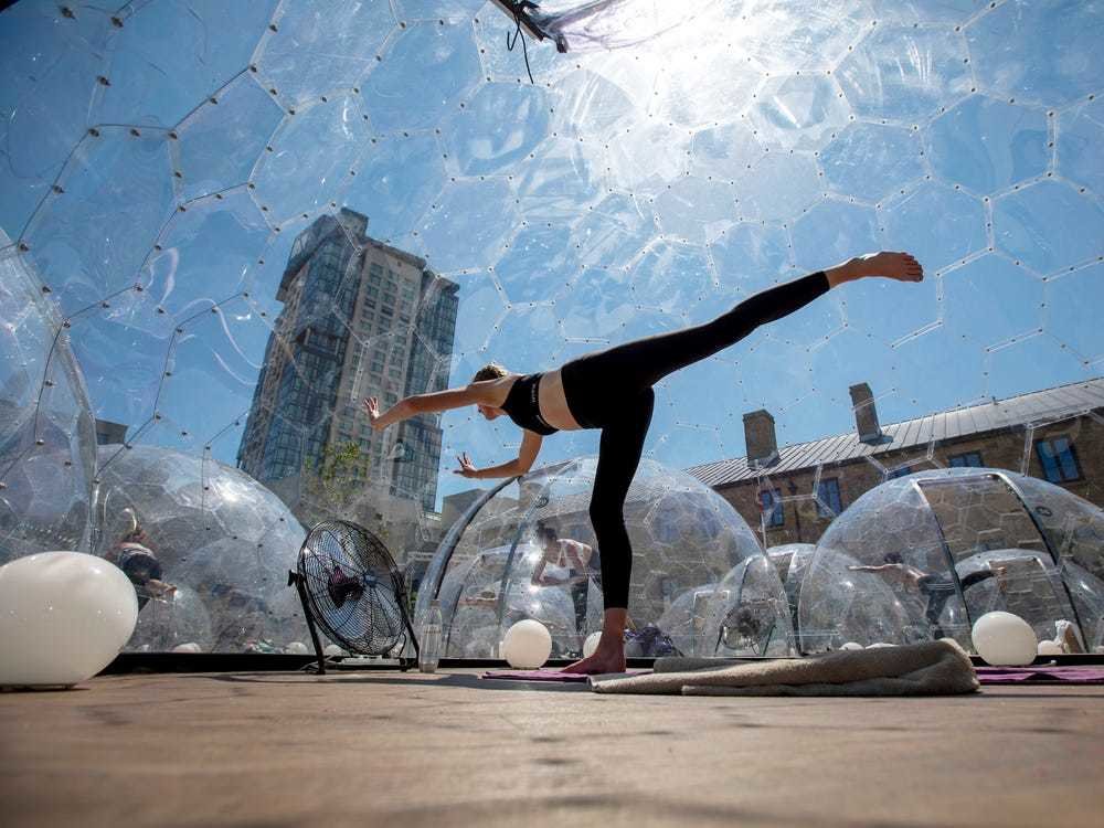 На вулиці легше дотримуватися соціальної дистанції, що робить тренування просто неба більш безпечними. Багато студій творчо підійшли до організації занять і почали проводити їх у парках, на пляжах і навіть на дахах. Канадська фітнес-студія lmnts Outdoor Studio взагалі практикувала тренування у величезних кулях, що забезпечують дистанцію.
