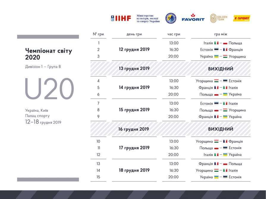 Першу гру збірної України проти збірної Угорщини заплановано на 12 грудня на 20:00. Також наші спортсмени вийдуть на лід 14 грудня о 20:00 проти Польщі, 15 грудня о 20:00 проти Франції, 17 грудня о 20:00 проти Італії та 18 грудня о 20:00 проти Естонії.