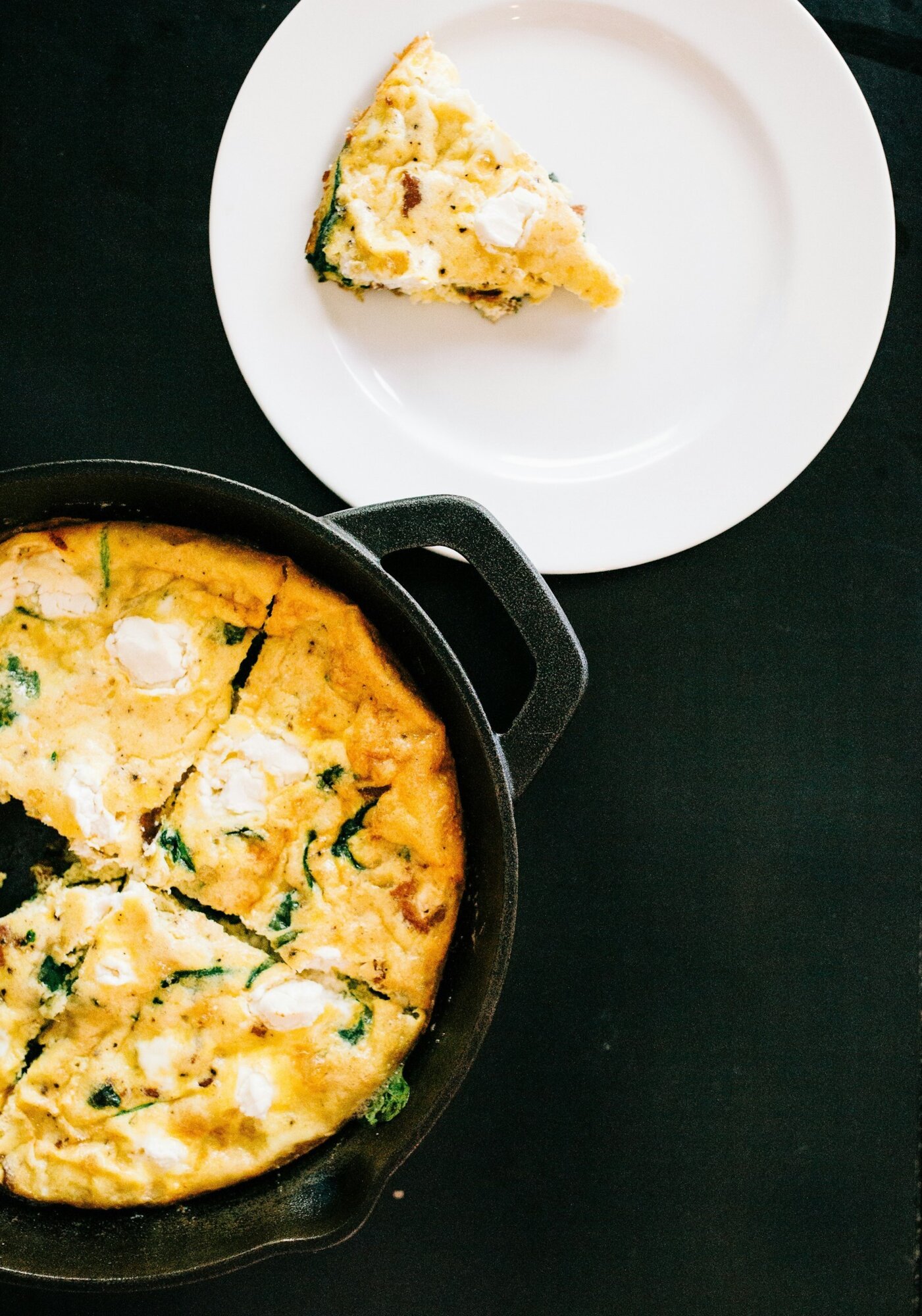 - Ингредиенты: 2–3 яйца, шпинат/зелёный лук, 30–40 г феты, 1 ч. л. оливкового масла.