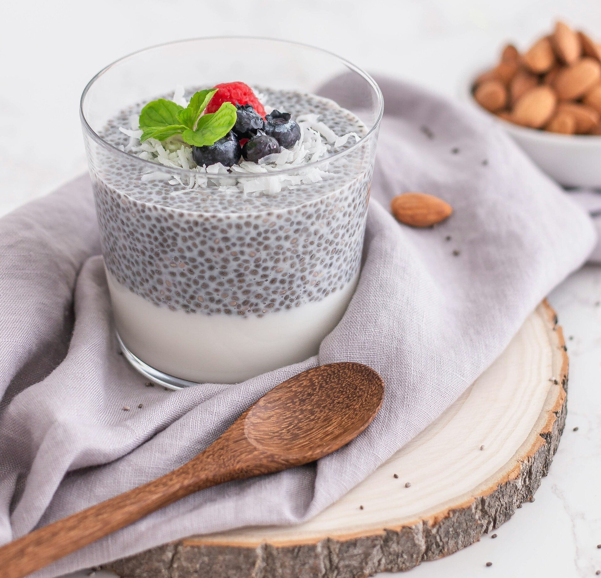 - База: 3 ст. л. чиа + 200 мл растительного молока + ваниль. Настоять 2–3 часа или на ночь.