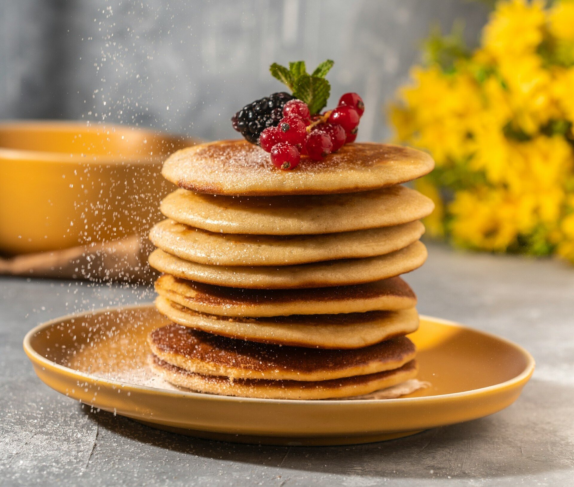 - Тесто: 1 яйцо, ½ банана, 3 ст. л. овсяной муки, ¼ ч. л. разрыхлителя, щепотка соли. Жарить на антипригарной сковороде.
