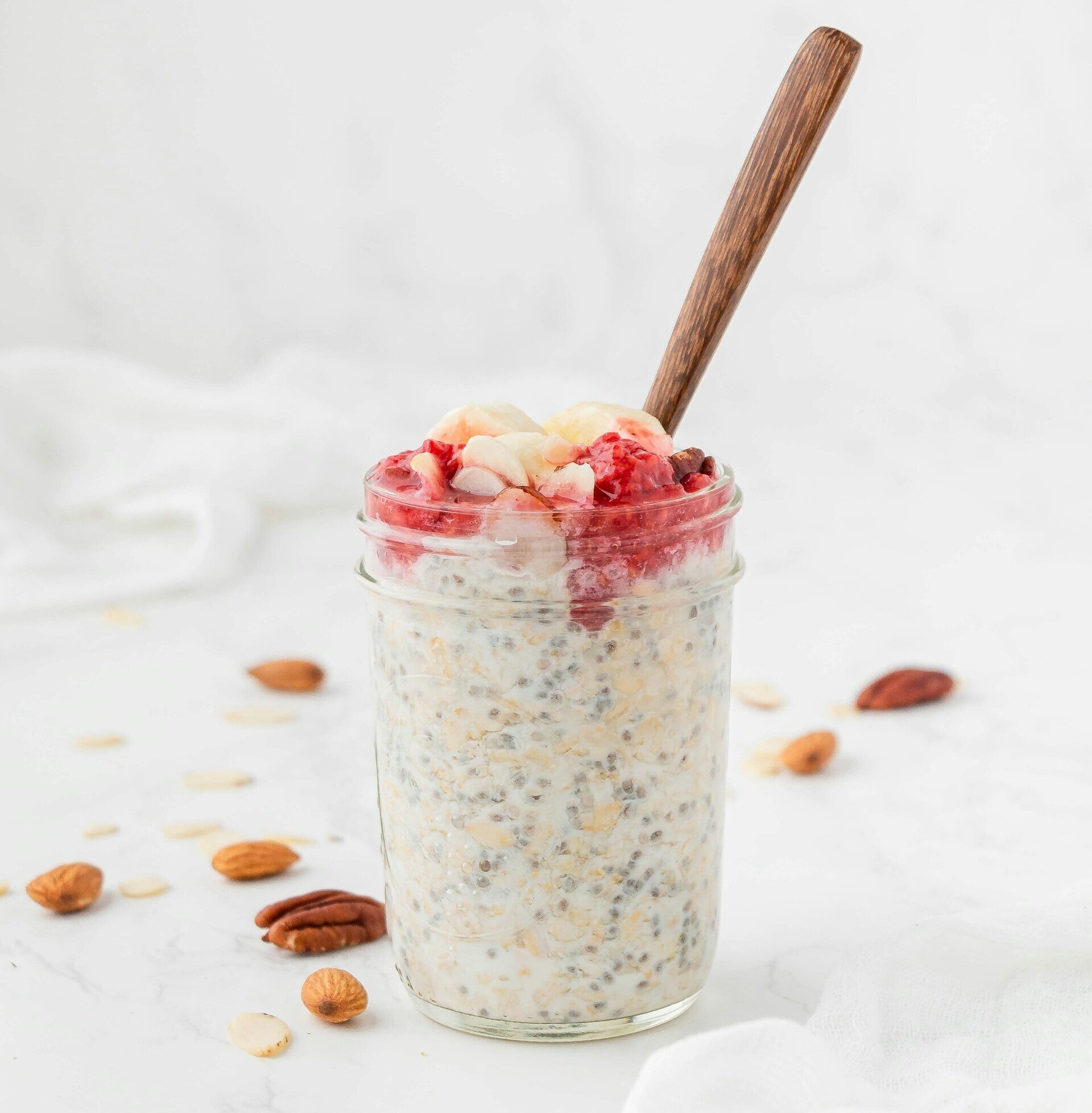 - База (на 2 порции): 1 стакан овсяных хлопьев, 1 стакан молока (любого), 2 ст. л. чиа или льна, щепотка корицы. Смешайте вечером — утром готово.