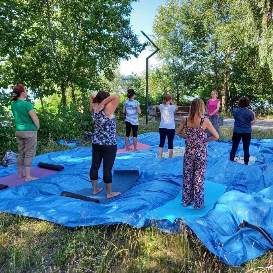 Не забываем взять коврик для занятия и бутылочку с водой)))) Занимаемся на голубом тенте!