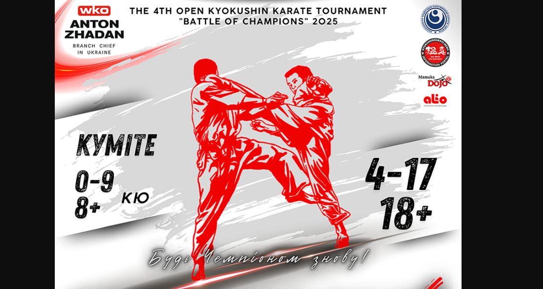 28 сентября 2025 года в Киеве пройдет 4-й открытый турнир по киокушинам каратэ «Битва чемпионов» (WKO Shinkyokushinkai) среди детей, юношей, юниоров, взрослых и ветеранов в разделе “кумите” и “ката”.