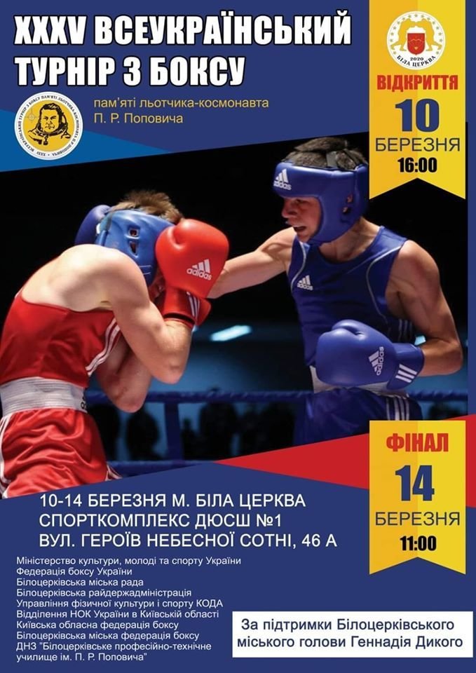 Add to calendarУже совсем скоро в Белой Церкви съедутся сильнейшие боксеры Украины, чтобы завоевать чемпионство и почтить память Героя Украины, летчика-космонавта Павла Поповича.