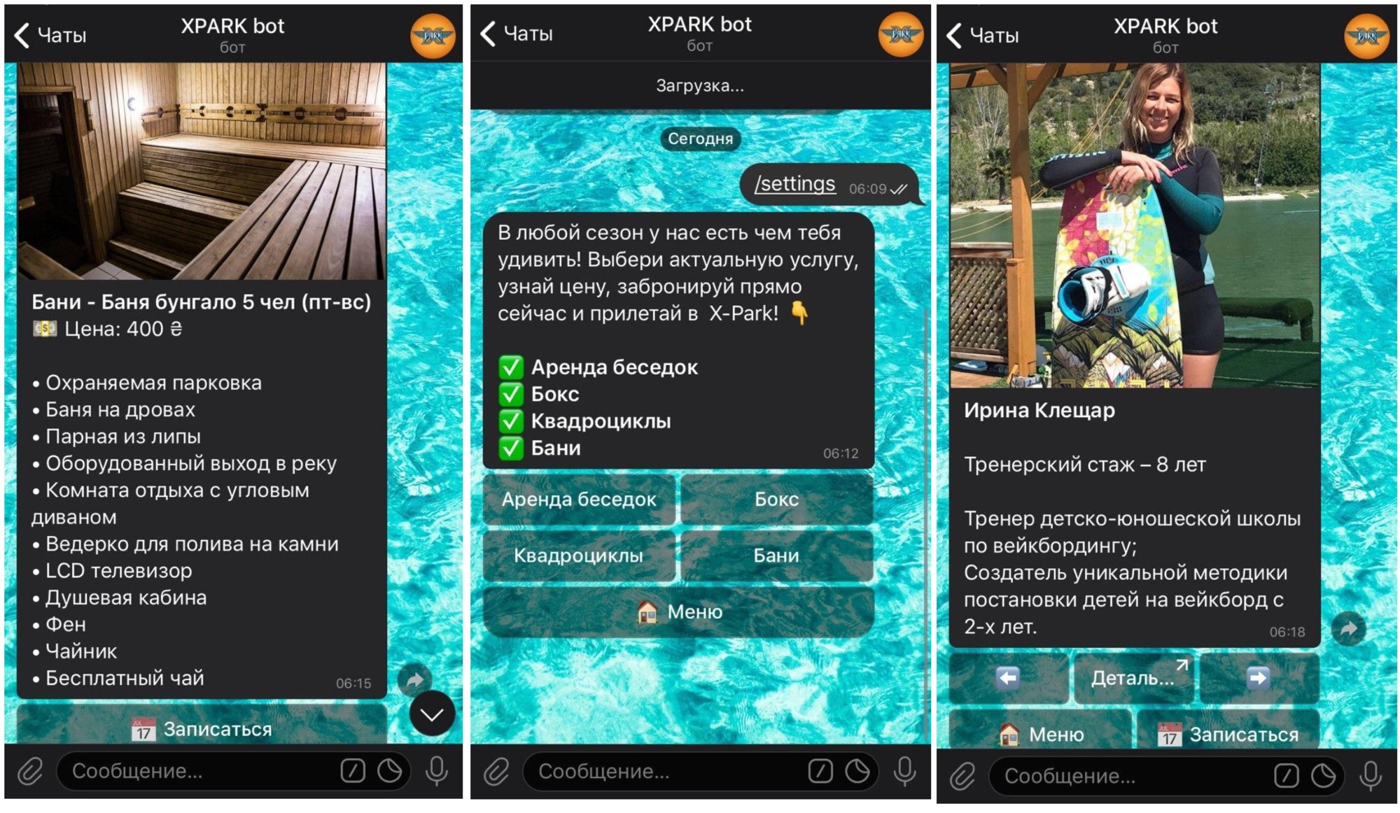 @Xpark_bot – це путівник спорткомплексом і помічник у бронюванні послуг. Він інформує про всі доступні послуги, наприклад, заняття боксом, катання на квадроциклах, оренда альтанок або лазні. Обравши послугу, ви можете дізнатися доступні дати, ціни на разове відвідування або на абонемент.
